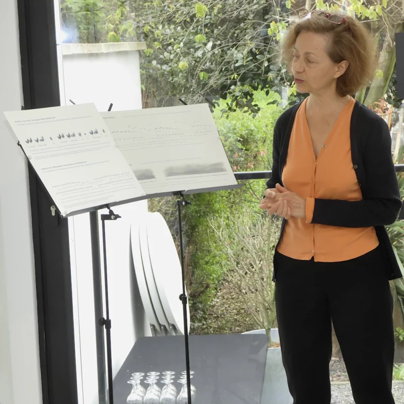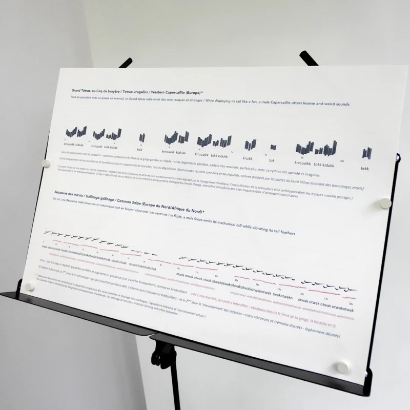 À partir de partitions de chants d’oiseaux qu’elle a elle-même analysés et retranscrits, l’artiste a offert une interprétation singulière, à mi-chemin entre lecture, performance et évocation sonore.