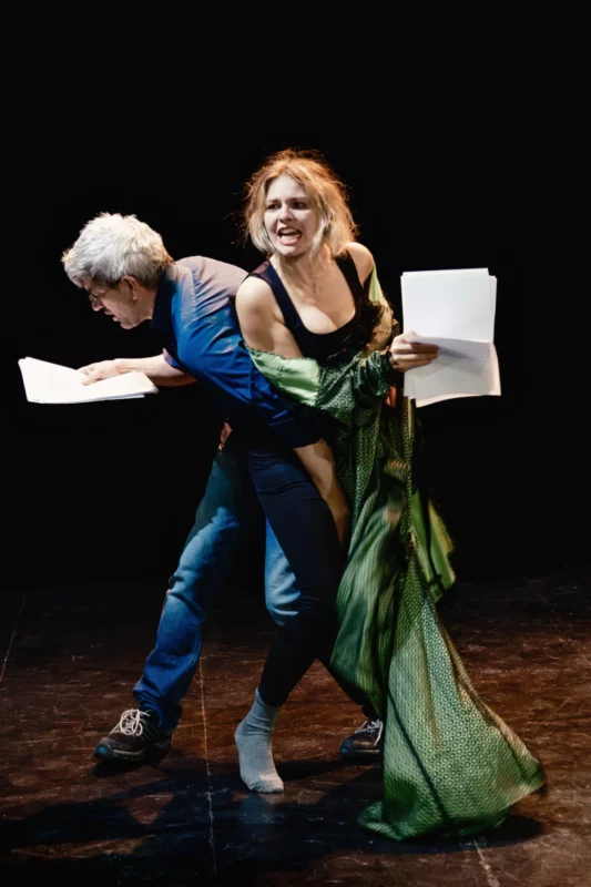Avec la présence du public, les équilibres se fissureront. Les désaccords éclateront, les faux-semblants tomberont, et le spectacle chavirera peu à peu. Drapés dans leurs vérités nues, les deux interprètes seront sommés de s’expliquer, de chercher ensemble une issue.