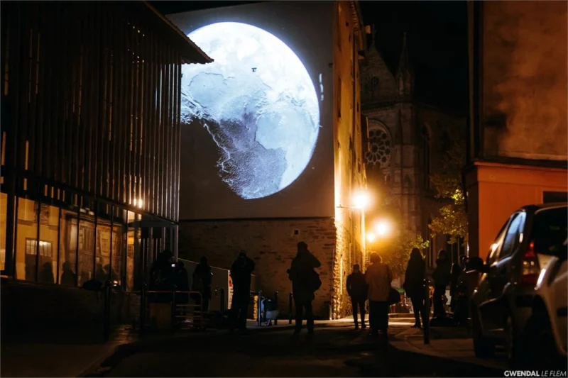 Une planète mystérieuse surgit sur un mur, des créatures lumineuses dansent dans les airs, un lampadaire s’incline doucement au passage des promeneurs, tandis que des jeux de lumière et de matière transforment l’espace en terrain d’expérimentation sensorielle.