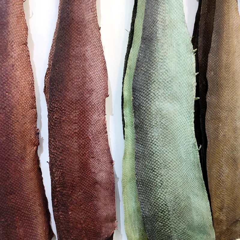 Autodidacte, Caroline se plonge dans la recherche, les essais et les expériences. Son défi : transformer des peaux de poissons, considérées comme de simples déchets de production, en un cuir noble, écologique et raffiné. En 2019, elle met au point ses premiers cuirs, et depuis, elle ne cesse d’affiner sa technique.