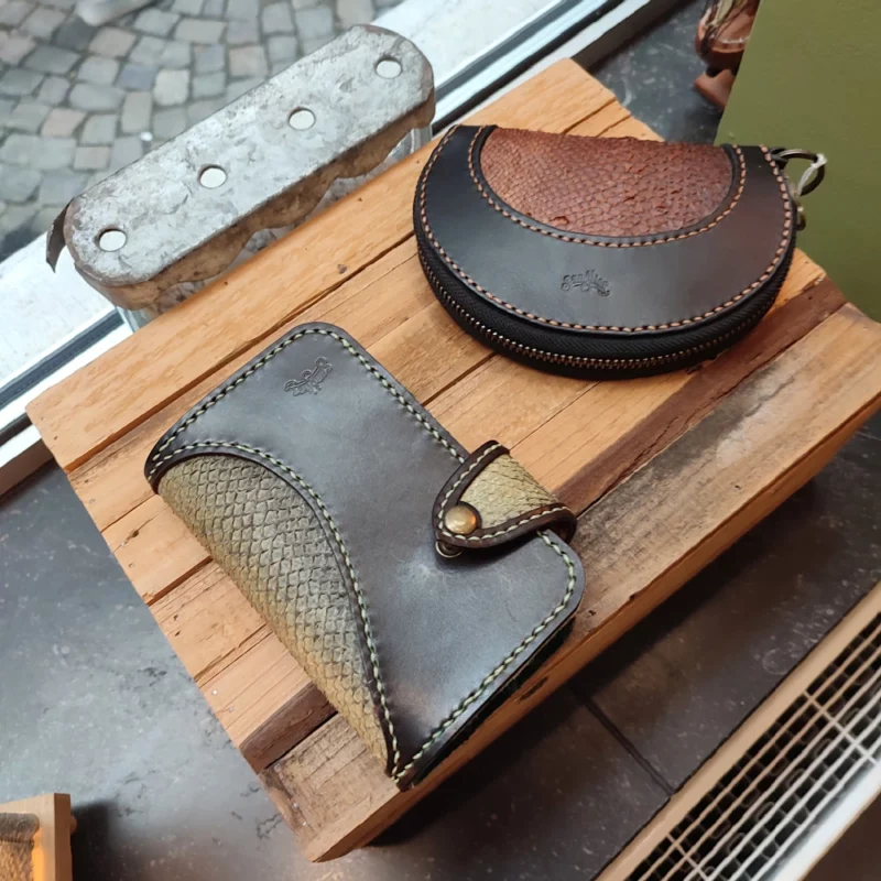 Depuis 2020, Peaux de Pêche propose une gamme d’accessoires en cuir de poisson : petites maroquineries, bijoux, objets du quotidien. Mais l’univers de Caroline ne s’arrête pas là. Elle imagine aussi des créations sur mesure, en collaboration avec des artisans ou pour des particuliers : chaussons pour bébé, menus de restaurant, étuis à couteaux… Chaque pièce est pensée comme une rencontre entre la matière et une histoire à raconter.