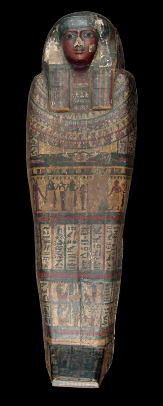 le cercueil d’Isistamen, daté de la Troisième Période intermédiaire (1069-664 av. J.-C.), fin de la 22e ou début de la 25e dynastie, une pièce majestueuse en bois, stuc et lin.