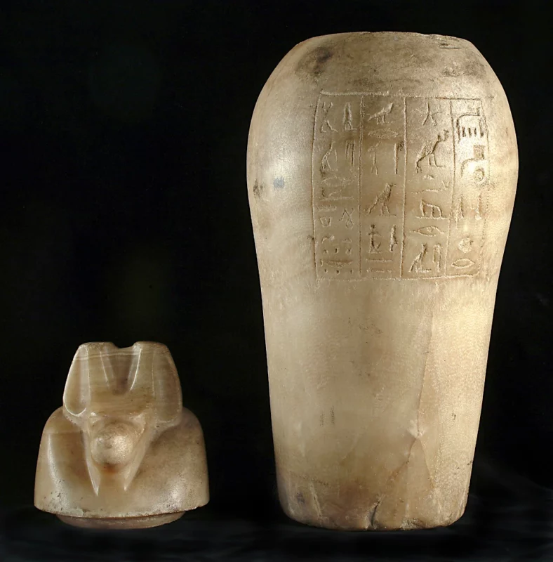 un vase canope de Hori en albâtre, datant du Nouvel Empire (XIXe dynastie, vers 1200 av. J.-C.), destiné à conserver les viscères d’un défunt pour l’éternité.